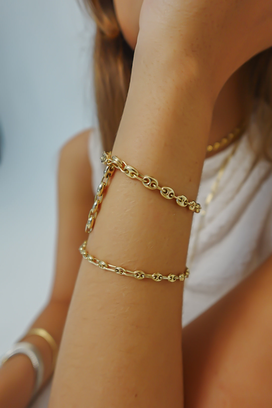 (TOP BRACELET ON IMAGE) Compared to standard gold plating, our gold vermeil boasts a substantial 14K yellow solid gold coating over 925 sterling silver, ensuring enhanced durability.