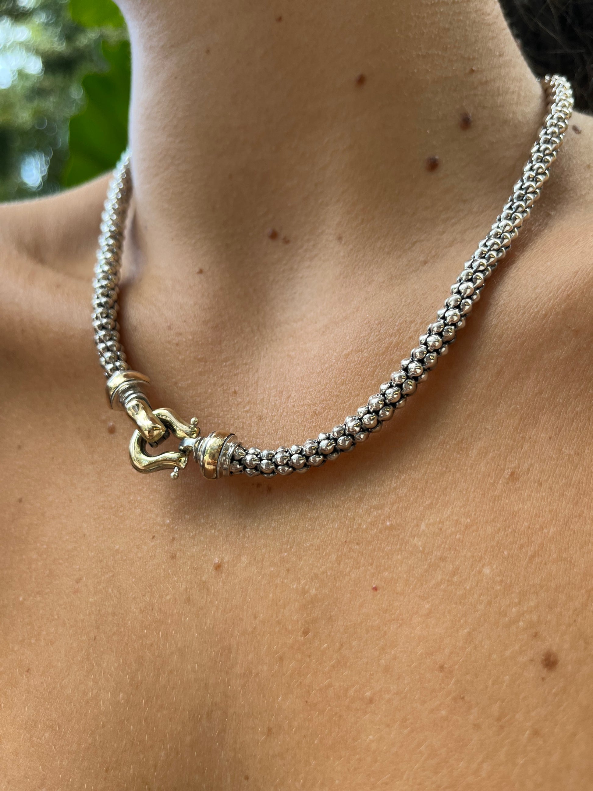 Use a polishing cloth to gently wipe silver and gold areas. For stains, use lightly diluted soap and warm water. Make sure to let it dry completely. Showering with 14K gold or 925 silver jewelry may eventually reduce the shine. We recommend polishing with a soft cloth every few months.