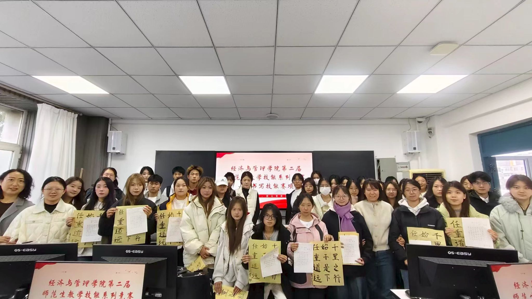 10月22日下午在第一教学楼412三字一话实训室进行的书写比赛拉开了本届系列竞赛的序幕。活动聘请了管理系主任高泽、孙虹飞老师、齐祺媛老师、黄续红老师担任本次比赛的评委。比赛严格遵循师范生技能要求,分为钢笔字、粉笔字和毛笔字三个项目,全面考察选手的书写技能。来自全院各年级、各专业的36名选手同台竞技,共展书写风采。“笔墨润心,字载师道”,选手们在黑板上、在纸面间、在笔墨中以极致的专注诠释未来教师的“工匠之心”。