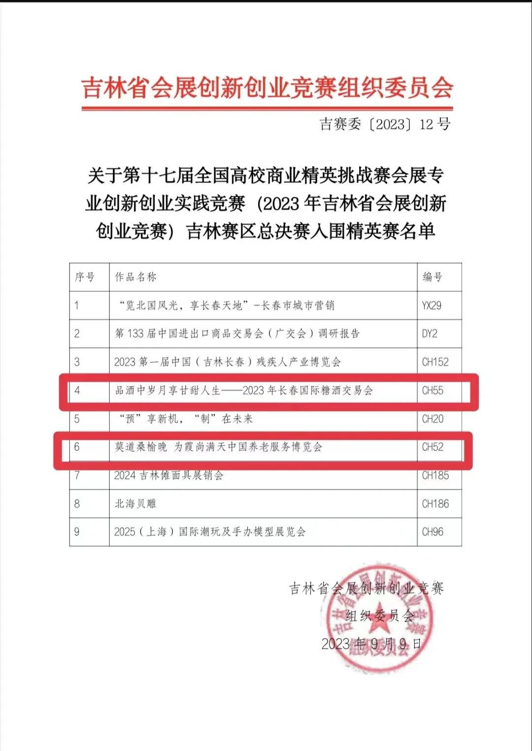 2023年9月9日—10日,由中国国际贸易促进委员会商业行业委员会、中国国际商会商业行业商会、中国商业经济学会共同举办十七届全国高校商业精英挑战赛会展专业创新创业实践竞赛吉林赛区总决赛圆满结束。经过专家评审共产生263个项目入围,yl88858永利集团22支队伍脱颖而出,入围最终省赛。最终2支队伍入围精英赛,直通国赛,8支队伍荣获省级一等奖,11支队伍荣获省级二等奖,3支队伍荣获省级三等奖!