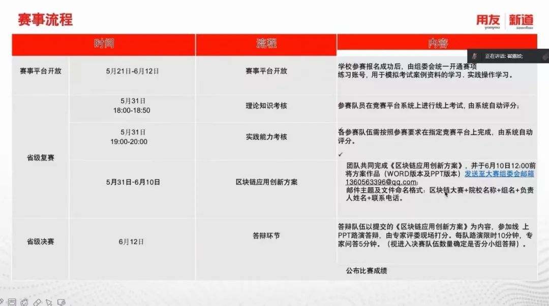 本次竞赛采用团队竞赛方式进行,分为4个环节团队总成绩总成绩=理论知识成绩*20%+区块链应用实操成绩*20%+区块链应用创新方案成绩*20%+创新方案路演成绩 40%。总成绩相同时,以创新方案路演成绩靠前者为先。