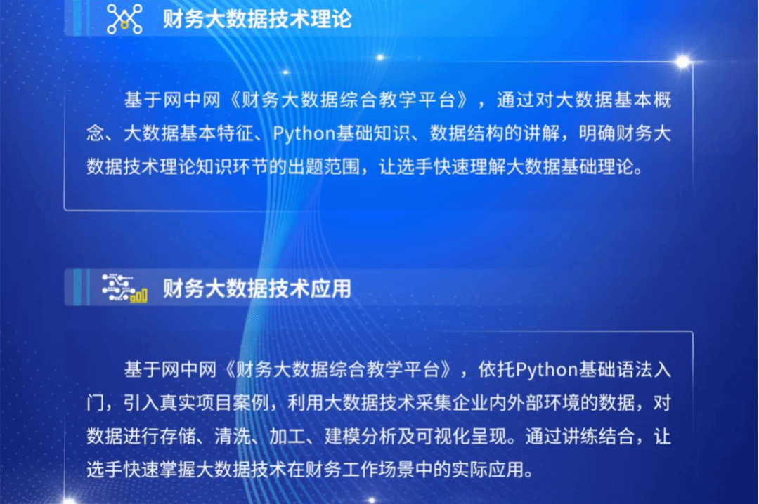 赛事由两大环节组成。第一大环节,EVC企业价值创造竞赛环节——团队中的4名选手分别担任企业的CEO、财务总监、运营总监、市场总监,进行战略规划、投资选址、物资采购、人员招聘等一系列生产经营决策、投融资决策、分配决策的制定与执行。第二大环节,财务大数据技术应用竞赛环节——选手们在财务大数据技术理论知识比拼中检验自身对大数据相关基础知识、综合应用及财务基础知识的掌握情况