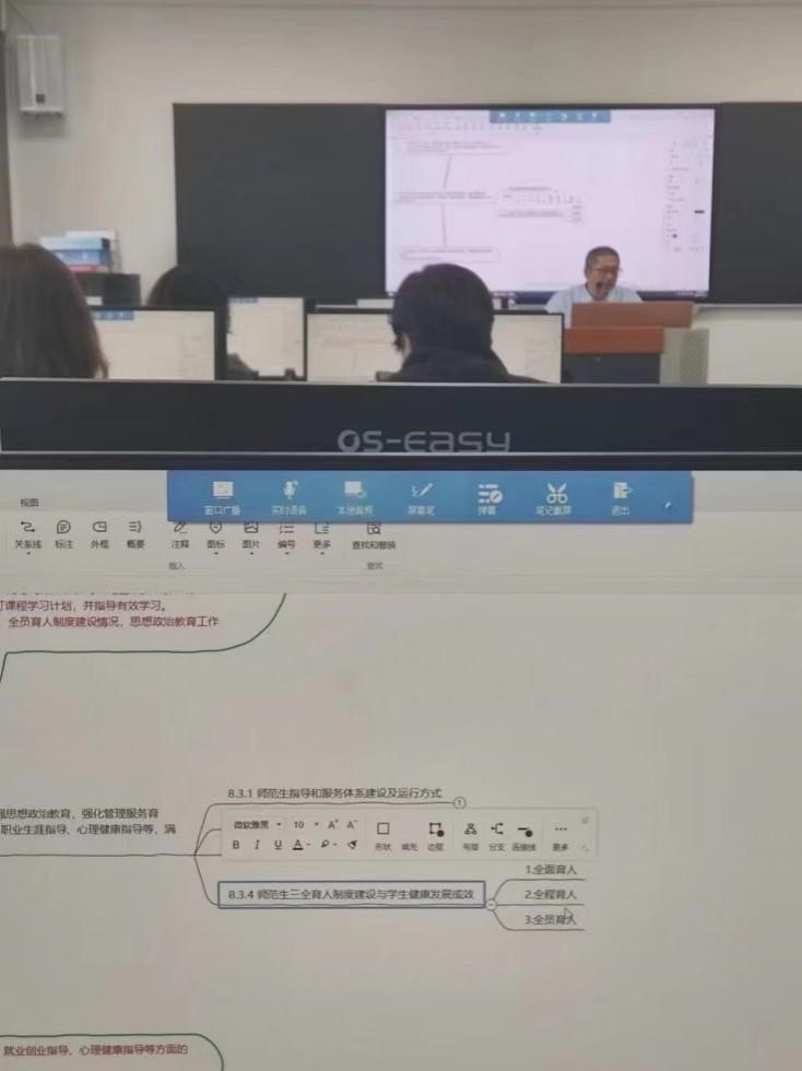 会议过程中,副院长刘春明采用思维导图方式,分别从达成情况、主要问题、改进措施三个维度,向参会教师详细讲解了自评报告中支持条件、质量保障、学生发展三个指标具体内容。