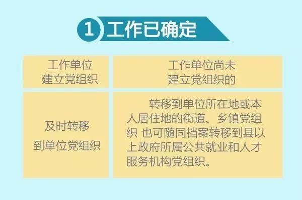 《中共中央组织部关于做好高校毕业生党员组织关系管理工作的通知(组通字〔2015〕33号)》中规定:对已落实工作单位的高校毕业生党员,其工作单位建立党组织的,应将组织关系及时转移到单位党组织。工作单位尚未建立党组织的,可将组织关系转移到单位所在地或本人居住地的街道、乡镇党组织,也可随同档案转移到县以上政府所属公共就业和人才服务机构党组织。