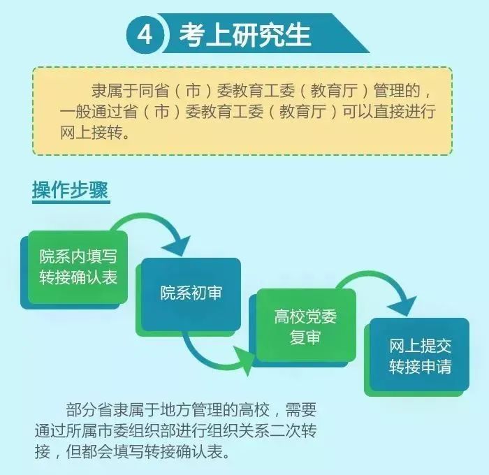 高等院校之间组织关系的转移:隶属于同省(市)委教育工委(教育厅)管理的,一般通过省(市)委教育工委(教育厅)可以直接进行网上接转,通常操作步骤是:院系内填写转接确认表—院系初审—高校党委复审—网上提交转接申请;部分省隶属于地方管理的高校,需要通过所属市委组织部进行组织关系二次转接,但都会填写转接确认表。