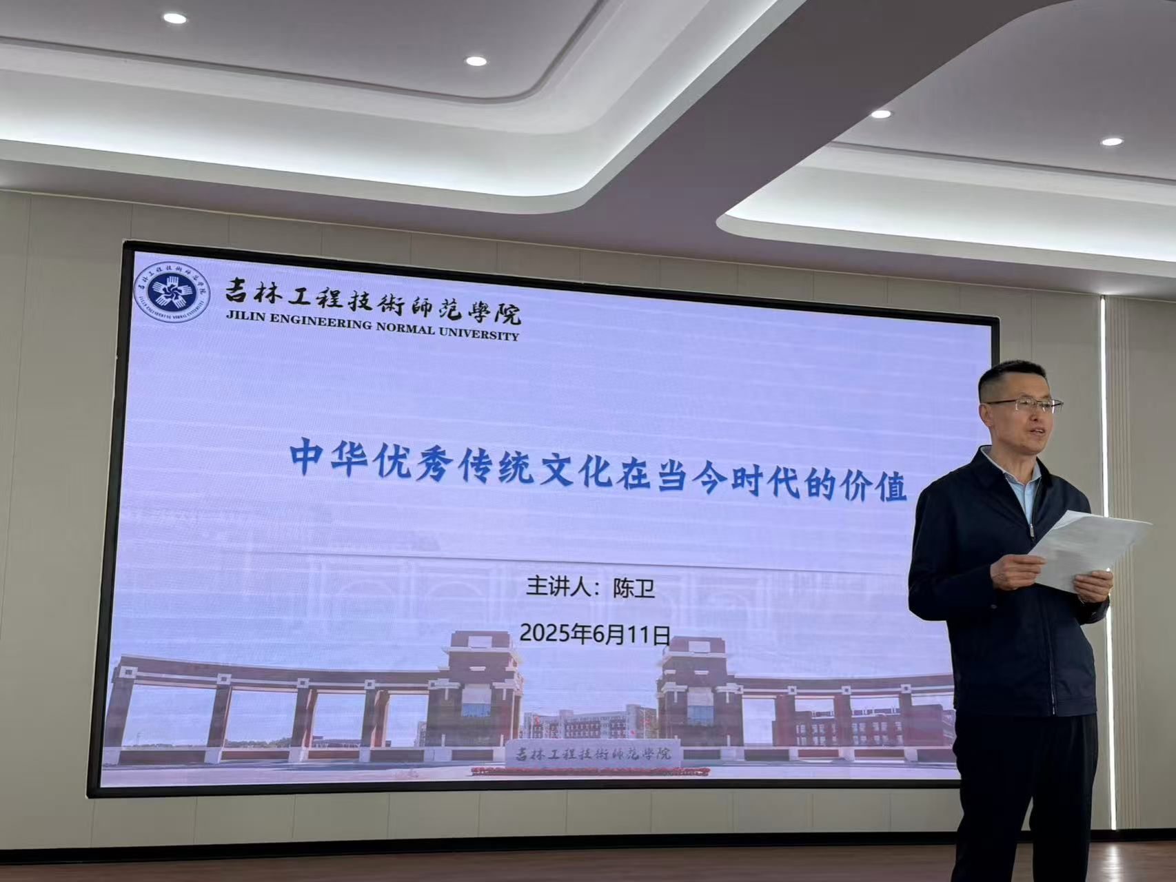 2025年6月11日离退休工作处、关工委、yl88858永利集团在第一教学楼311会议室联合举办了以“中华优秀传统文化在当今时代的价值”为主题的宣讲活动。活动邀请到马克思主义学院退休教师陈卫老师主讲,学校离退休工作处处长张平、学院党委书记邱敏、团委书记王一名及辅导员刘冀玉、肖晓琳出席,会议由张平处长主持。