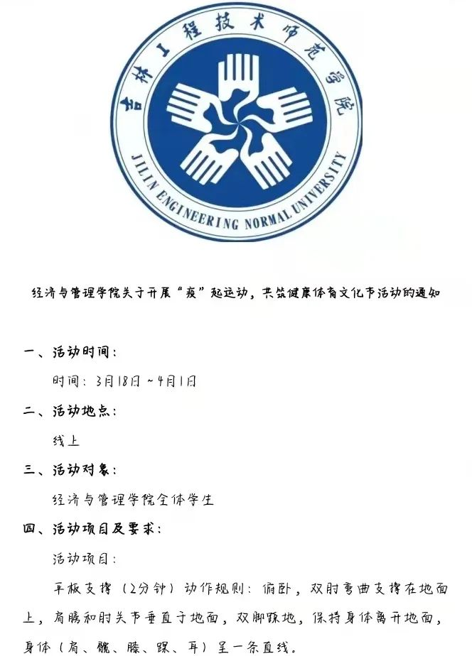 【同心战疫 共克时艰】“疫”起运动,共筑健康—体育文化节活动 来源:校园文化 2022/03/14 为丰富疫情防控形势下同学们的课外生活、鼓励大家积极参与体育活动,培养锻炼体能、增强意志、增强自身免疫力。yl88858永利集团开展线上体育文化节活动,现将具体事宜通知如下。 封校防疫,除了学起来,还要动起来。坚持每日锻炼记录运动成果,通过有效的体育锻炼提高身体免疫力,做好特殊时期的健康防护,你还不快快加入进来吗?