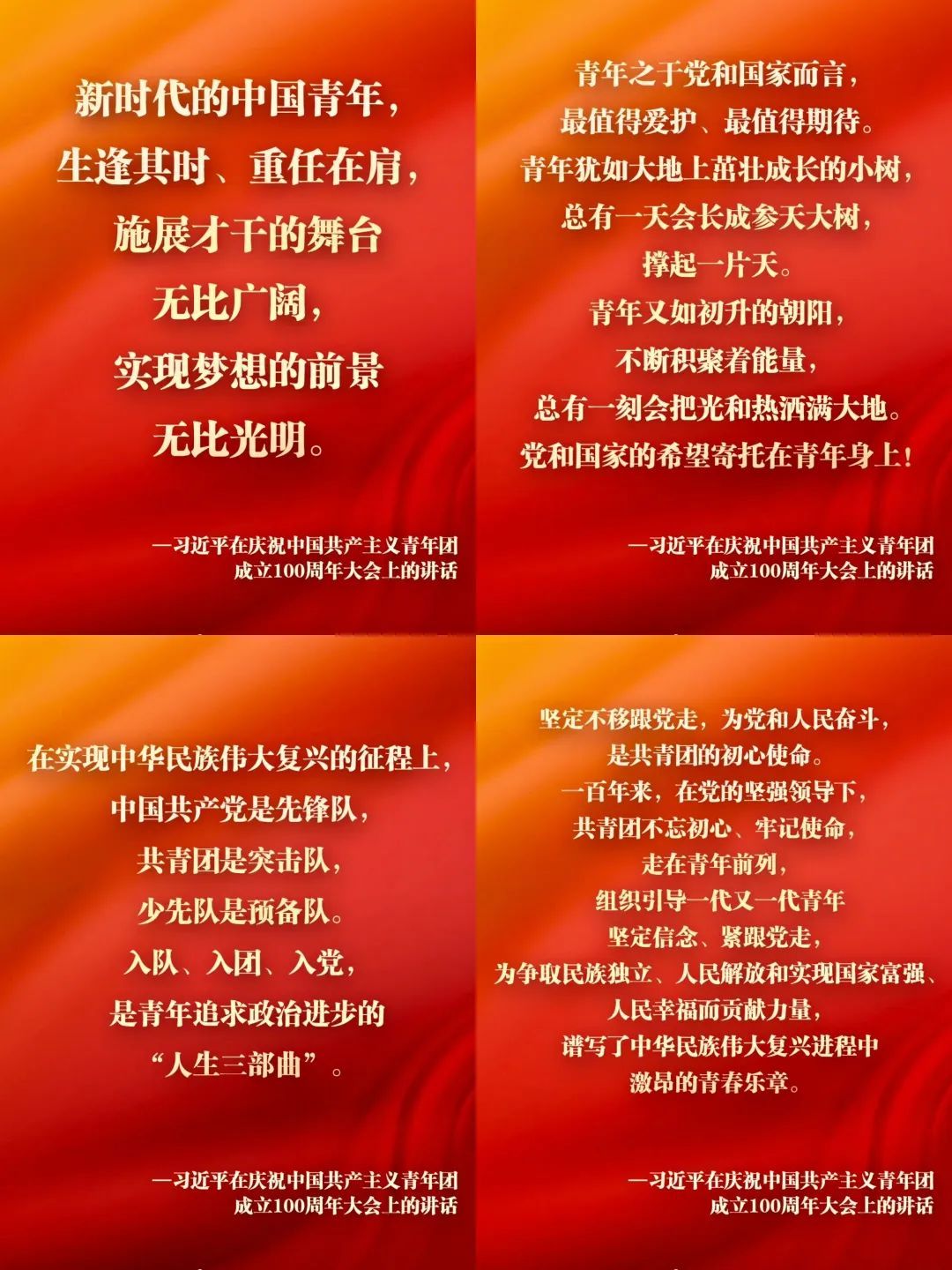今天,我们在这里隆重集会,庆祝中国共产主义青年团成立100周年,就是要激励广大团员青年在实现中华民族伟大复兴中国梦的新征程上奋勇前进。