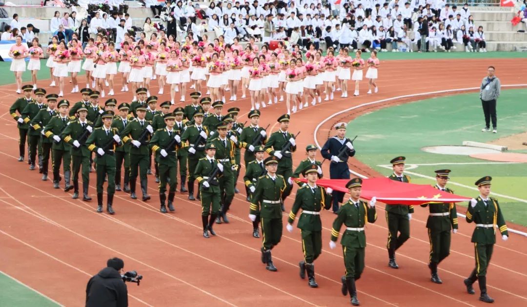 国旗护卫队、校旗护卫队擎着国旗、校旗,迈着正步从主席台走过,为运动会拉开序幕。