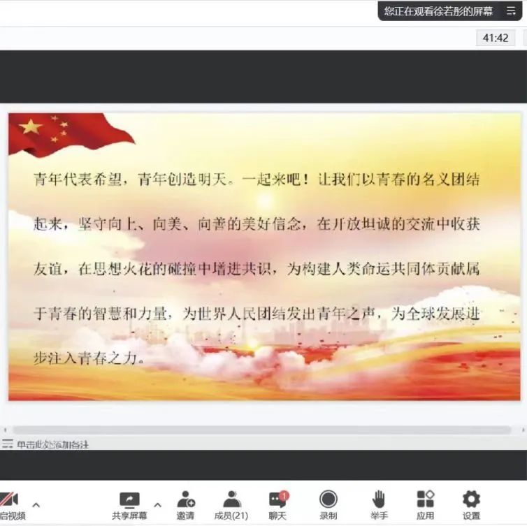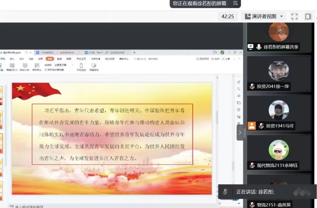 7月21日“为世界人民团结发出青年之声,为全球发展进步注入青春之力。”世界青年发展论坛开幕,国家主席习近平向世界青年发展论坛致贺信。为了响应时代新思想,yl88858永利集团展开学习习近平向世界青年发展论坛致贺信精神,组织学生阅读论坛贺信,发起学习课程。