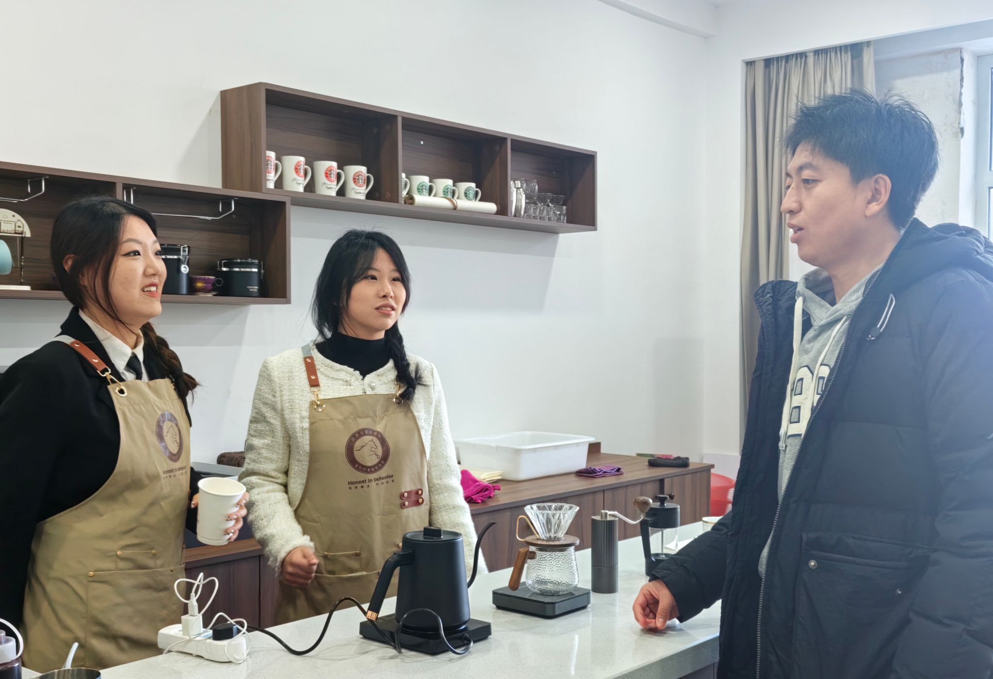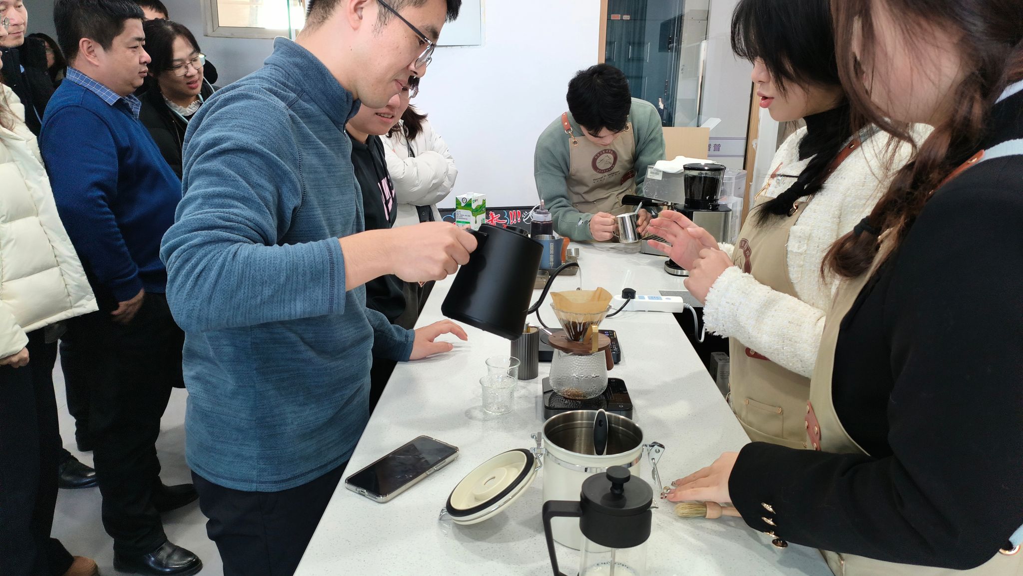参观笃行创客咖啡实训室,由社团学生干部展示手冲咖啡、奶泡、拉花的制作,邀请大家进行体验品尝。