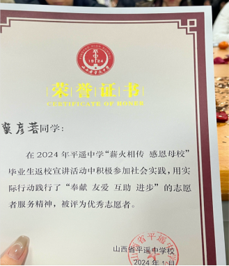 旅游管理2341——冀彦蓉:我的社会实践服务于山西省平遥中学,作为平遥大学生联合会项目部成员,紧跟平遥中学返校大学生进行宣讲和高考经验分享,参加平遥古城察院视频拍摄活动的相关工作,包括前期线上联络、核查信息、组织沟通、中期活动开展和后期工作总结。工作的过程令我收获颇丰,同时也让我深刻认识到作为当代青年,要多参加社会实践活动,走进家乡,为家乡教育事业作出贡献!