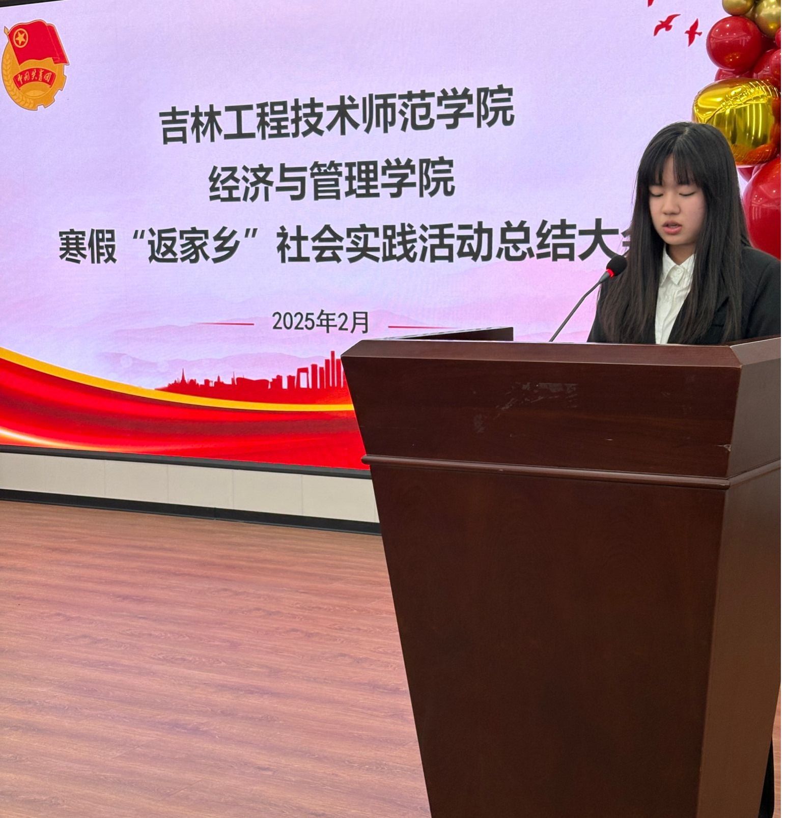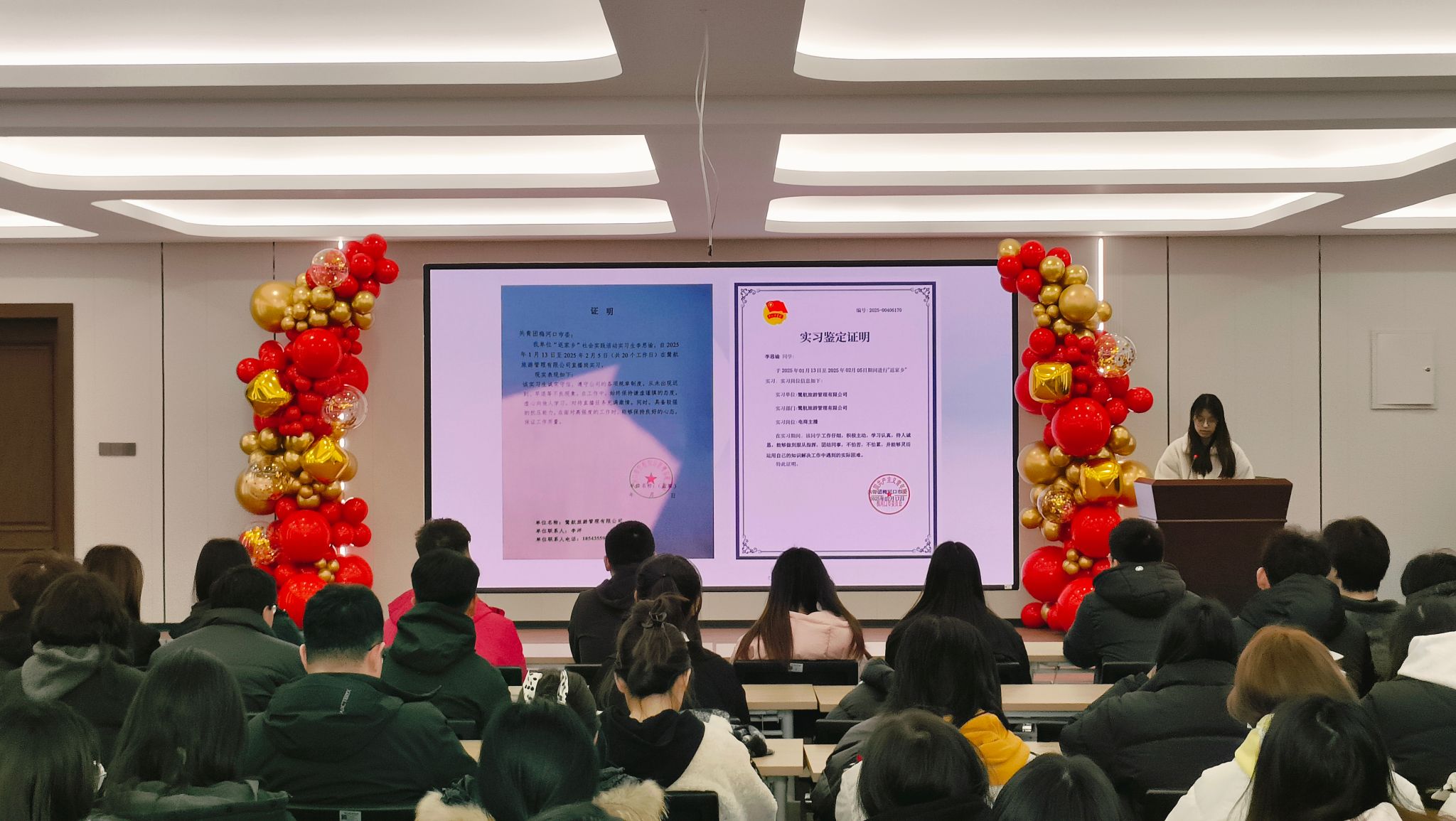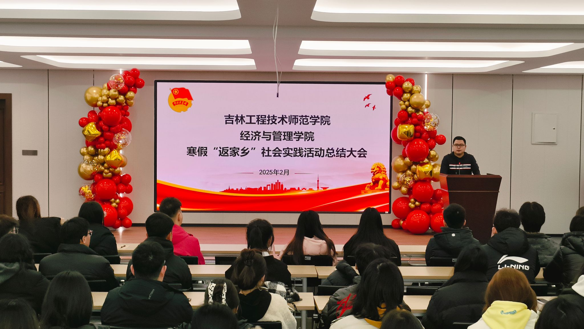 在热烈掌声中,大会进入最后环节——播放寒假“返家乡”回顾视频。播放时,熟悉画面接连闪现,同学们社会实践的点滴被串联起来。视频里,欢笑、汗水、协作清晰可见,曾经的困难与挑战也化作成长路上的宝贵财富,让大家重回那段充实忙碌的时光。这次“返家乡”社会实践总结大会,回顾过往、洗礼思想。同学们明确实践意义,坚定决心,愿为家乡和祖国发展贡献力量。