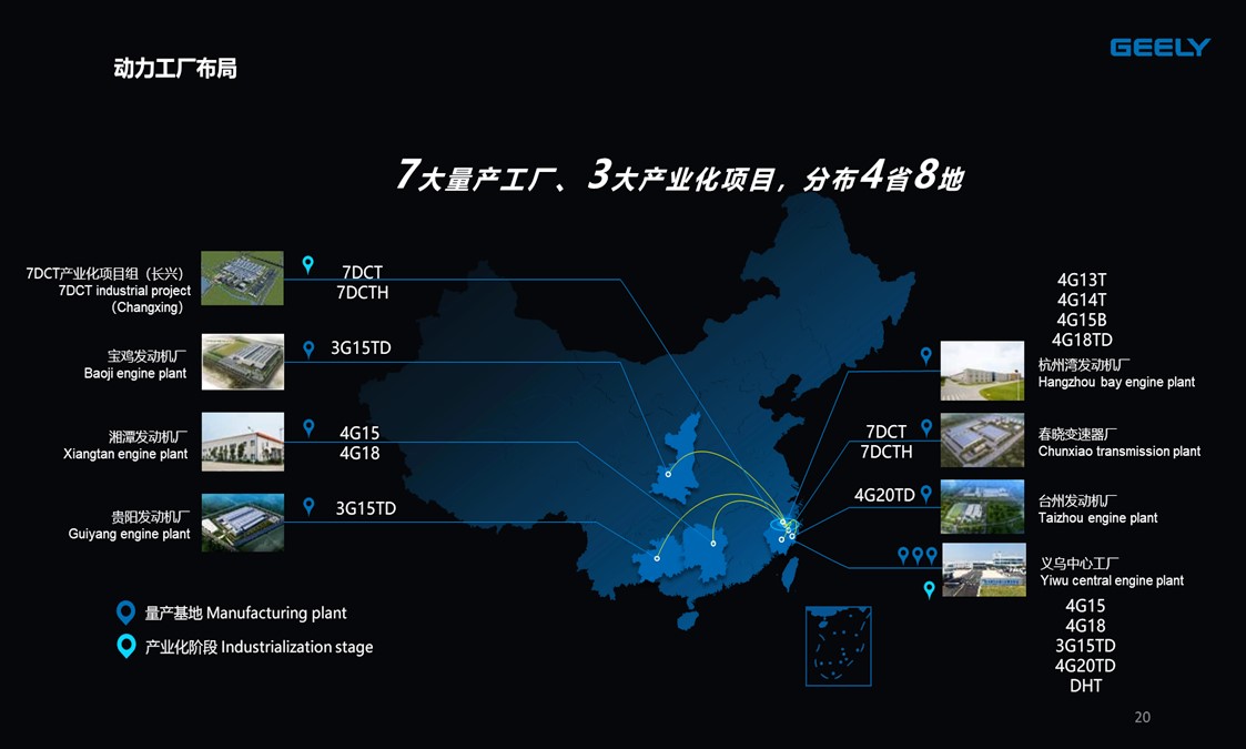 公司总部设在浙江义乌,下设8个子公司,目前在浙江宁波、浙江义乌、浙江台州、浙江长兴、陕西宝鸡、贵州贵阳设有量产发动机厂5个、变速器厂3个、4 个职能中心、以及财务、IT、保卫、法务、GPES Pro 项目组等4 个派驻单位和项目组。各工厂产品覆盖1.0L-2.4L 排量自然吸气、涡轮增压及缸内直喷发动机和7 速双离合自动变速器、DHT 混动专用变速器。发动机及变速器产品将配套在吉利品牌、领克品牌、沃尔沃品牌汽车上,致力于打造国际一流的动力总成产品。动力制造基地覆盖全国3 省6 市7 地。