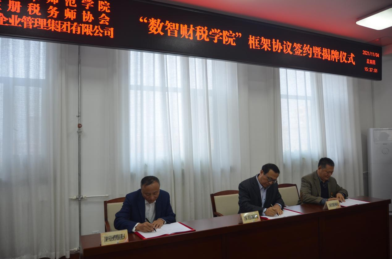 杨晓东校长、徐永义会长、王晓刚董事长分别代表各方签订了合作共建“数智财税学院”框架协议,三方代表共同按动了数智财税学院启动按钮。