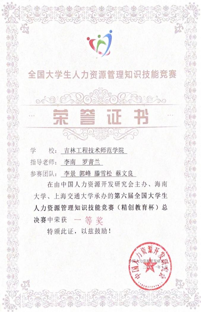 第六届全国大学生人力资源管理知识技能竞赛总决赛10月21日~24日在海南大学圆满结束。本次盛会由中国人力资源开发研究会大学生知识技能竞赛理事会主办,海南大学管理学院、上海交通大学承办,参赛队伍由各大区赛共358所院校中,经过选拔的普通高等院校在校人力资源管理专业大学生构成,其中本科组有61所学校,专科组有10所学校,共71所学校参加比赛。我校工商管理学院人力资源专业学生在李南和罗青兰两位指导教师的带领下,以第四大区特等奖的身份晋级全国总决赛。在比赛中,同学们充分展现了专业素养,最终获得了全国大学生人力资源管理知识技能大赛总决赛一等奖的佳绩,同时也被大赛授予最佳风采奖。