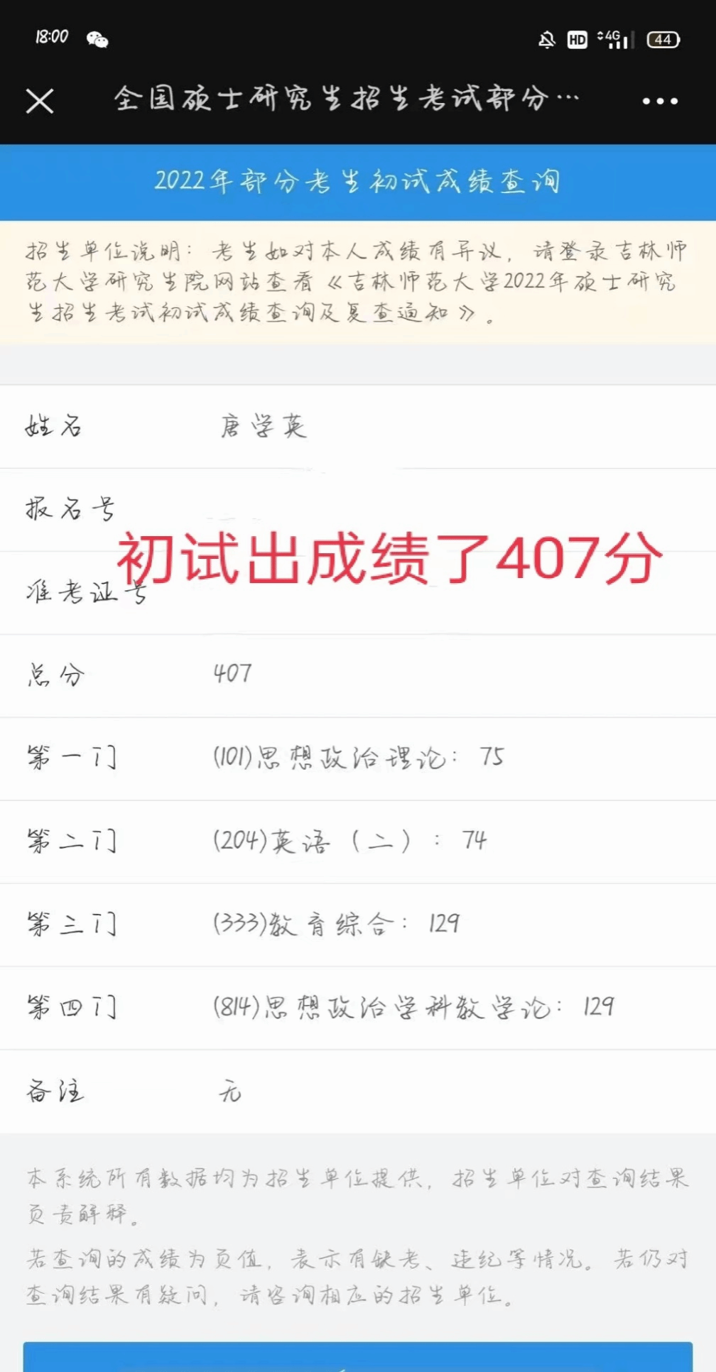 一共四科成绩在心里默默算了两个月,总算到了出成绩的这一天,407分,对自己的初试成绩还是挺满意的。