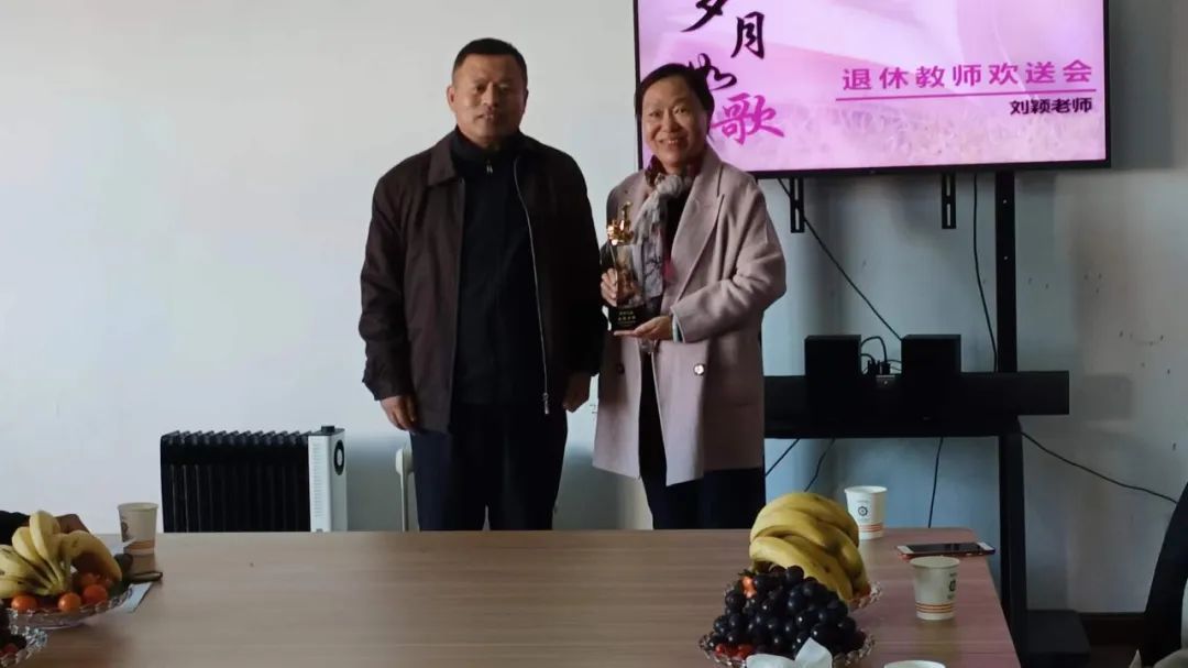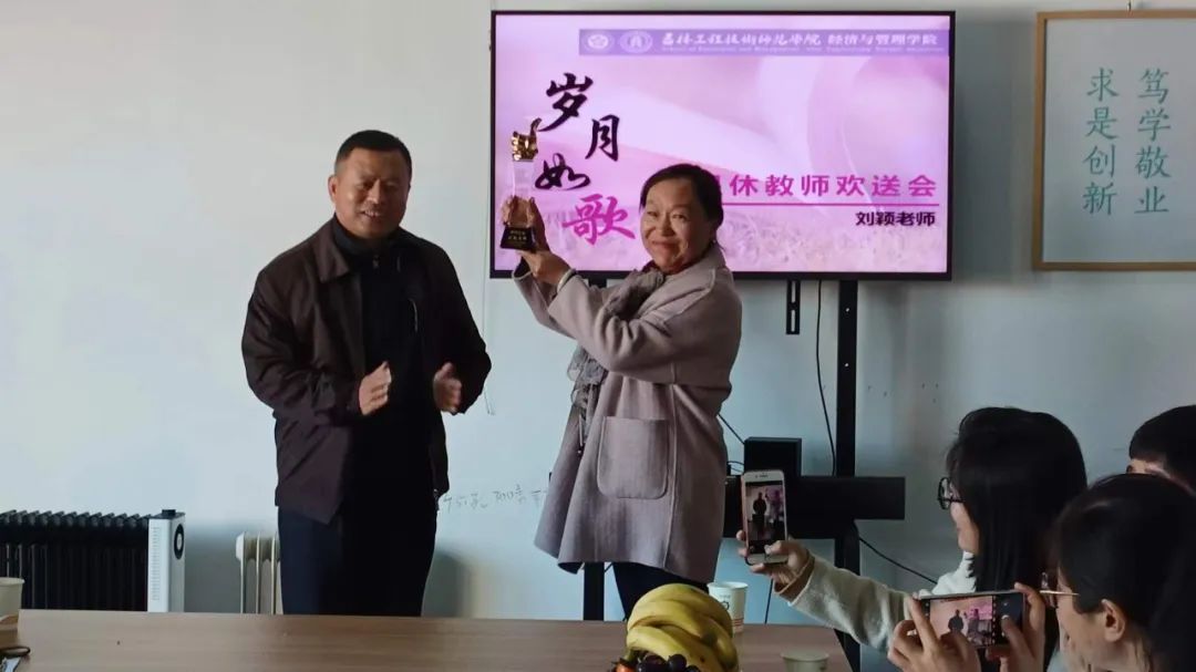 在热烈的掌声中,正处级组织员任志宏给刘颖老师敬献退休奖杯,一个奖杯,承载着经管学院对刘颖老师的肯定与祝福。