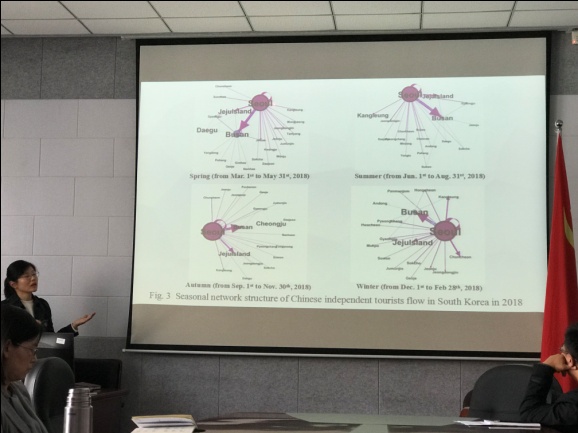 2020年9月16日,由工商管理学院主办的“社会网络分析法在旅游流研究中的应用”学术大讲堂成功举行。本次大讲堂由工商管理学院旅游管理教研室王春艳副教授主讲,王春艳副教授具有16年高校教师教学经验,曾赴法国、越南、韩国等国家进行学术交流。公开发表学术论文20余篇,其中EI会议检索论文3篇,SCOPUS检索论文1篇,韩国KCI收录论文2篇,CPCI-S检索论文7篇,CPCI-SSH检索论文2篇;主持完成省级教科研课题8项,横向课题4项,主持的课题到帐经费累计22.3万元,参与各级各类教科研课题共计40余项,累计参与的课题到帐经费达到94.3万元;参编教材3部;获各类校级奖励6次。会议由工商管理学院副院长罗青兰主持。王春艳副教授将韩国学习成果进行分享,她的研究表明,社会网络社会网络分析方法适用于旅游流的研究,网络游记可以作为旅游流研究的数据来源,研究成果对韩国、越南开拓中国旅游市场、开展其国内旅游规划具有指导意义。并进一步指出自身未来研究方向应把旅游流的研究内容应扩大到网络结构洞的分析,可视化分析有待进一步加强,如利用GIS软件辅助地图工具等。最后,总结了科学研究的严谨性至关重要,交叉学科比较容易出成果,掌握一种研究方法非常重要三点学习体会。