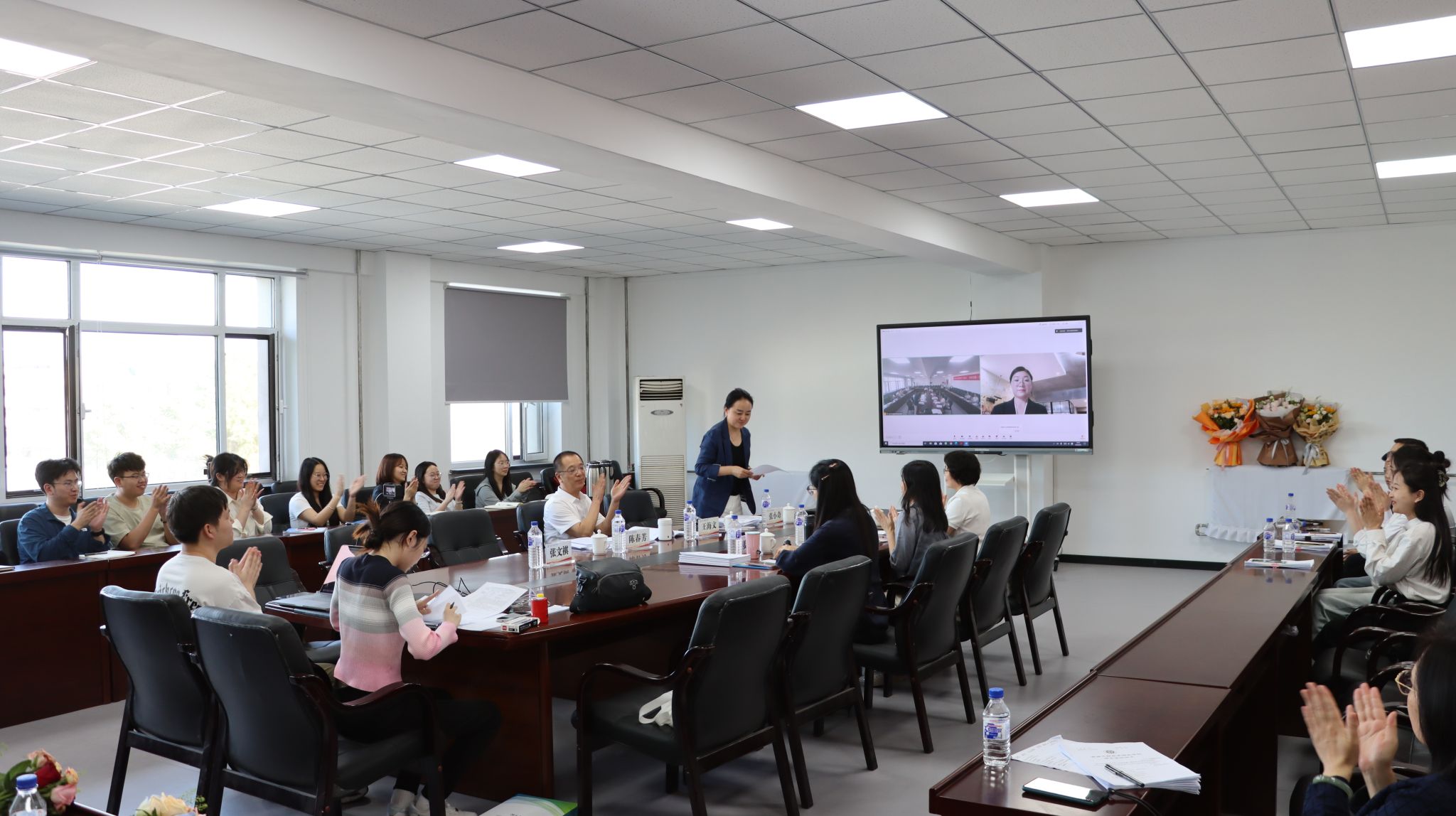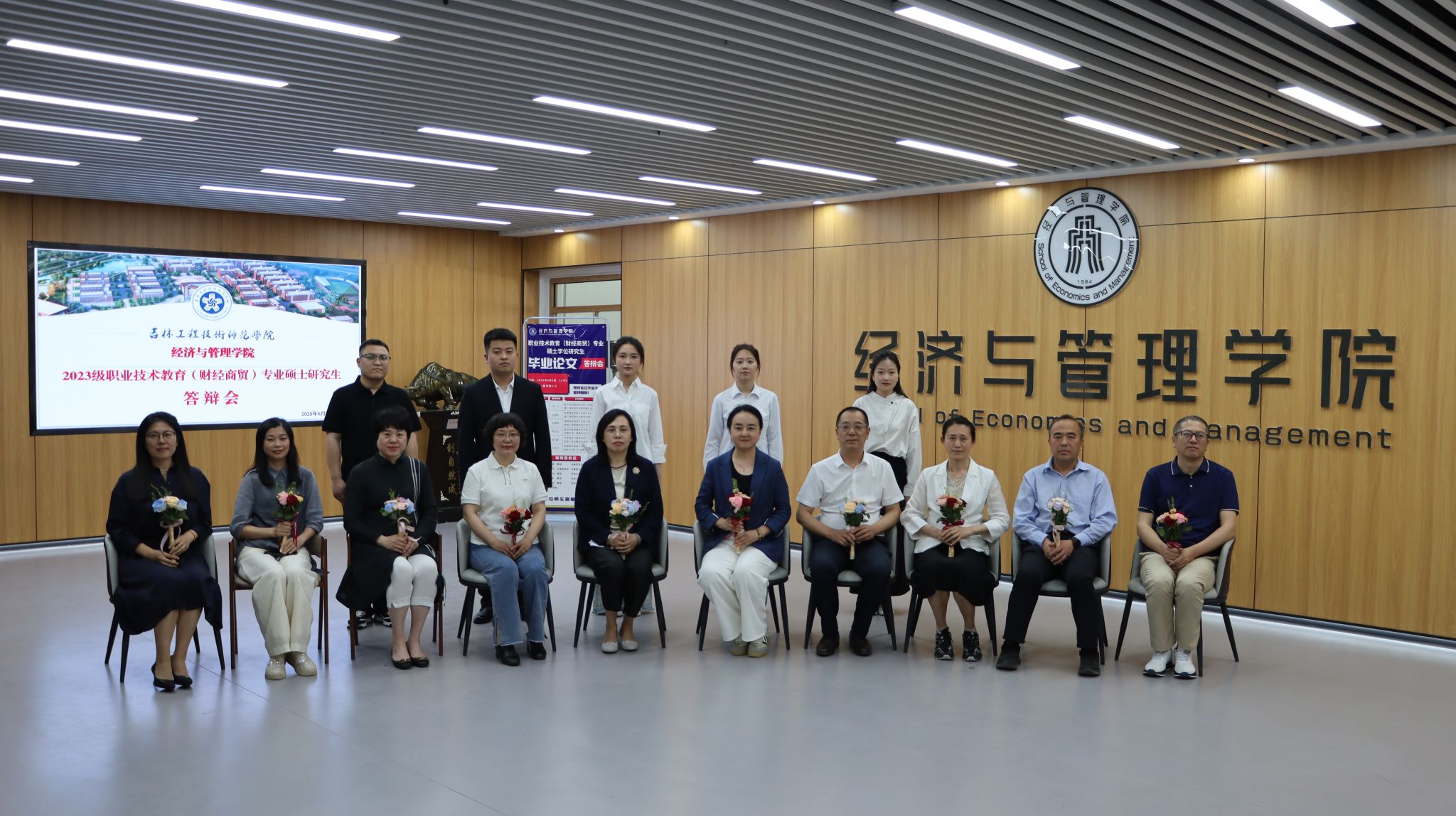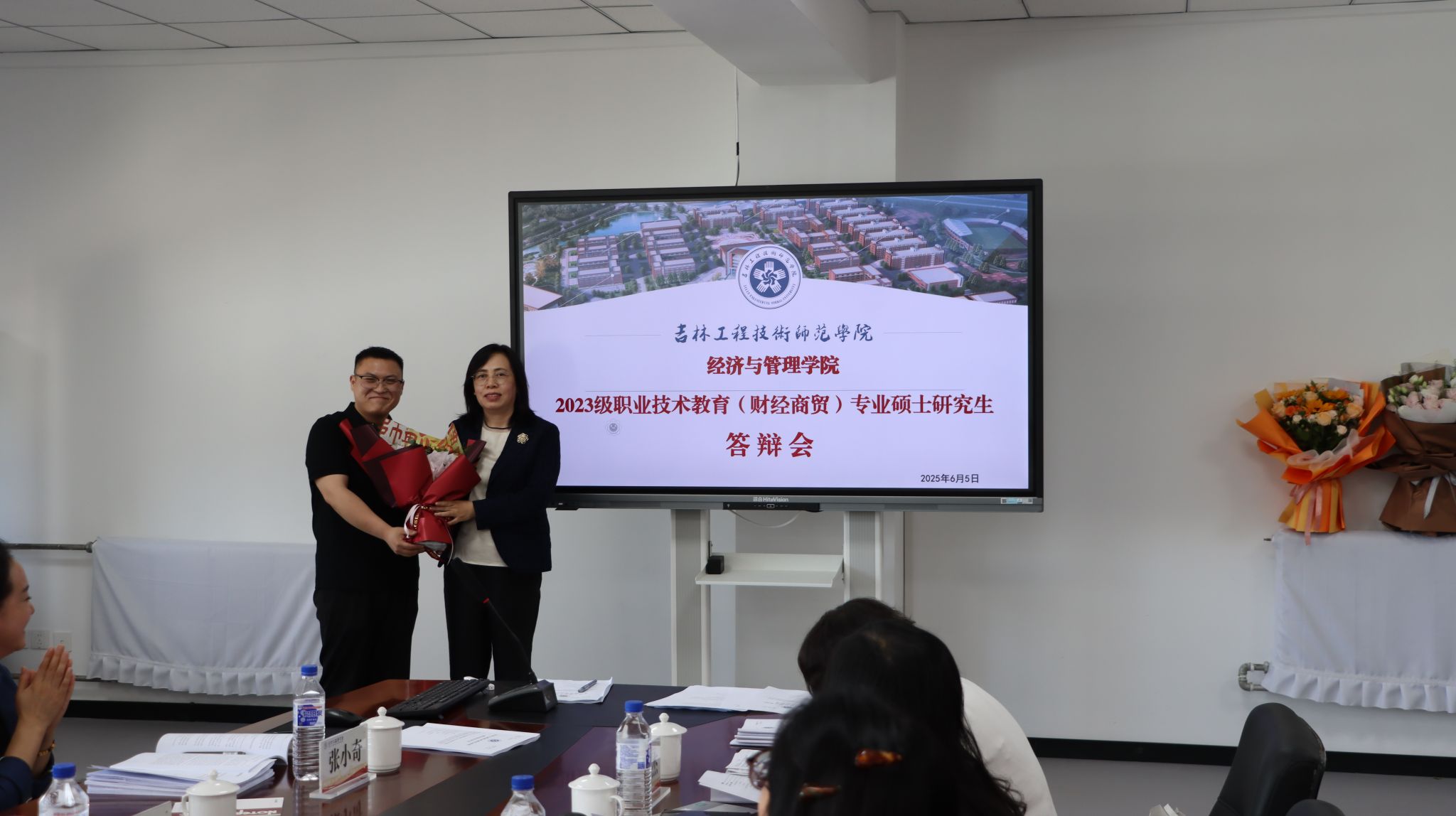 值得一提的是,本次答辩还特别设置了温馨感人的谢师恩环节,每一位同学在答辩结束后,手捧精心准备的鲜花,郑重地献给自己的导师,并深情鞠躬致谢。一句真挚的 “感谢老师”,传递着研究生们对导师两年来悉心指导和关怀的感激之情。导师们接过鲜花,脸上洋溢着欣慰的笑容,或与学生紧紧相拥,或轻声叮嘱鼓励,现场氛围温馨而热烈。这一环节不仅是对师生情谊的美好见证,更彰显了尊师重道的优良传统。