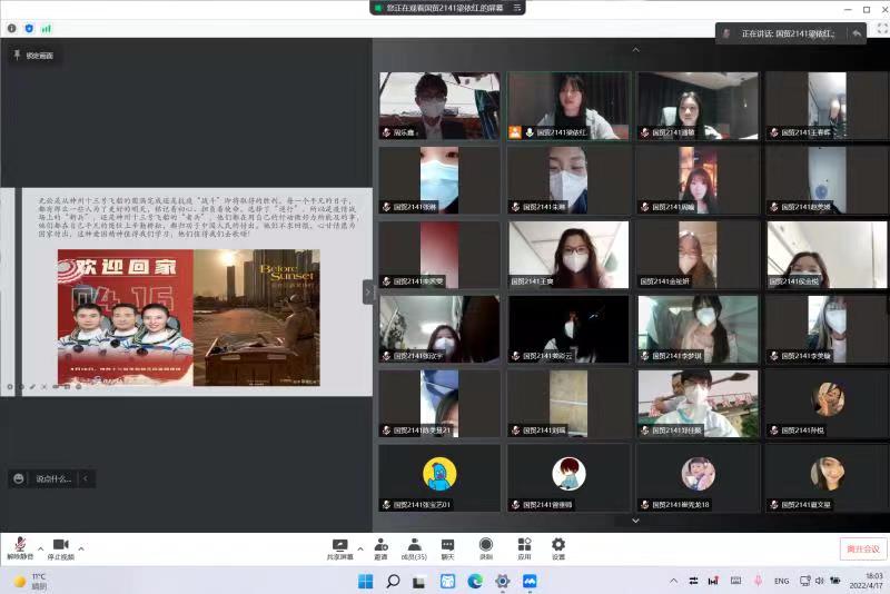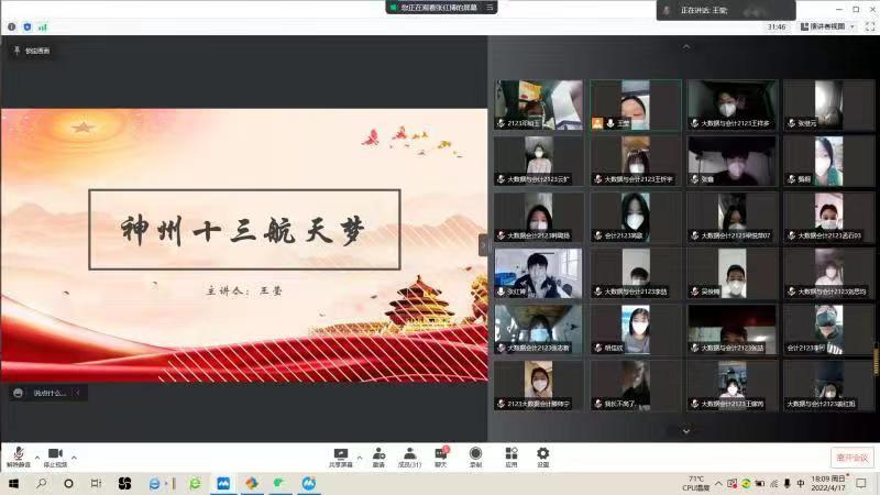 为带领同学们了解中国航天发展历程,学习航天精神,落实习近平总书记“七一”重要讲话精神,增强同学们的爱国热情,激发创新意识,yl88858永利集团于2022年4月17日在腾讯会议开展“学习航天精神,厚植爱国情怀”主题团会活动。